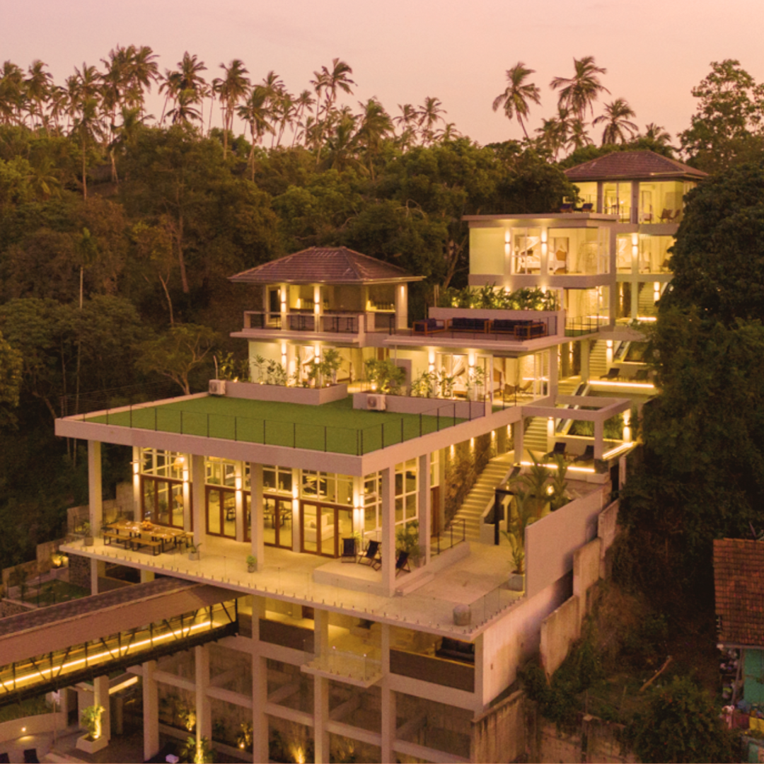 A 9-level, 10,500-square foot luxury hideaway on a lush green hillside with breathtaking views, a stunning private pool area with lounge chairs, a wide open terrace for workouts, and plenty of comfortable nooks for enjoying quiet solitude in a nature-rich setting.